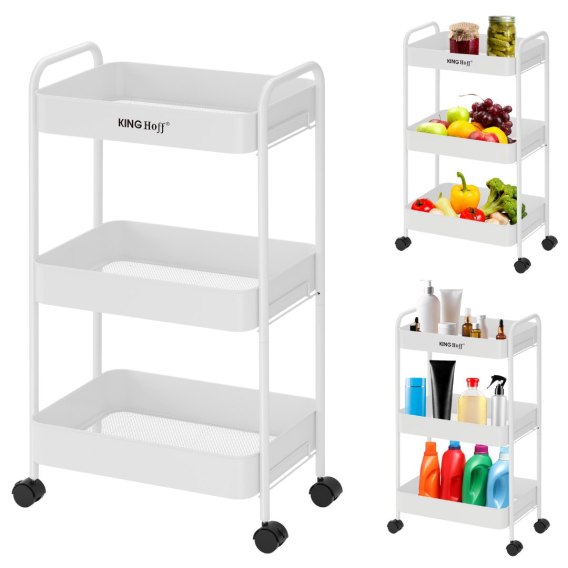 • Regał 3-poziomowy stalowy z kółkami 360°, biały, KINGHOFF KH-1942