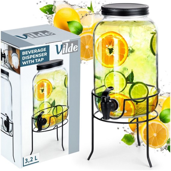 Zestaw składający się ze słoja z kranikiem oraz stojaka na słój. Idealny do serwowania wody, lemoniady, soku, herbaty mrożonej, wody smakowej, ale również ponczu. Dzięki kranikowi w łatwy sposób zaserwujemy ulubione napoje w sposób efektowny. Słój ze stojakiem wykorzystamy zarówno w ogrodzie, jak i podczas spotkań rodzinnych. Dzięki zamykanej pokrywie żadne owady nie dostaną się do naszego napoju. Wykonany jest z materiałów bezpiecznych dla zdrowia i neutralnych dla żywności. Nie nadaje się do napojów gorących. Uwaga! Na opakowaniu widnieje błędna informacja dot. pojemności, faktyczna pojemność jest zgodna z powyższym opisem. Oryginalny produkt marki Vilde. Wyprodukowano zgodnie z europejskimi standardami.