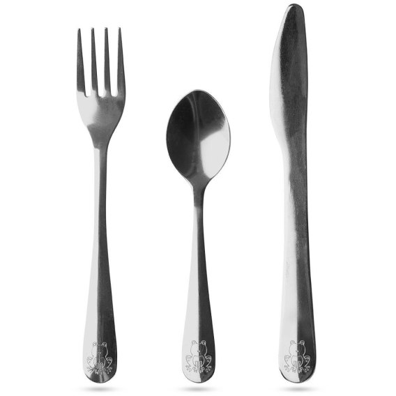 3-elementowy zestaw sztućców dla dziecka z dekorem żabki. Zestaw zawiera łyżeczkę, widelec oraz nóż. Wykonane ze stali nierdzewnej.