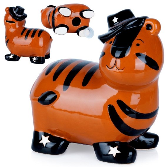 - Skarbonka tygrys - Skarbonka w kształcie uroczego tygryska. Idealna do zbierania oszczędności. Skarbonka ma wymiary 15,5 x 10 x 16,5 cm. Dzięki unikalnemu wyglądowi stanie się wesołym elementem dekoracyjnym każdego wnętrza.