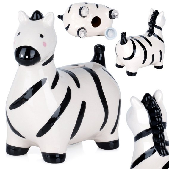 - Skarbonka zebra - Skarbonka w kształcie zebry. Idealna do zbierania oszczędności. Skarbonka ma wymiary 16,5 x 10,5 x 17 cm. Dzięki unikalnemu wyglądowi stanie się wesołym elementem dekoracyjnym każdego wnętrza.