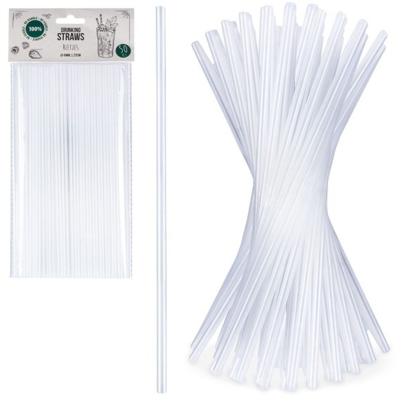 Wielorazowe słomki do napojów wykonane z polipropylenu w przezroczystym kolorze. W zestawie 50 sztuk słomek. Słomki Idealne do zimnych jak i ciepłych napoi.