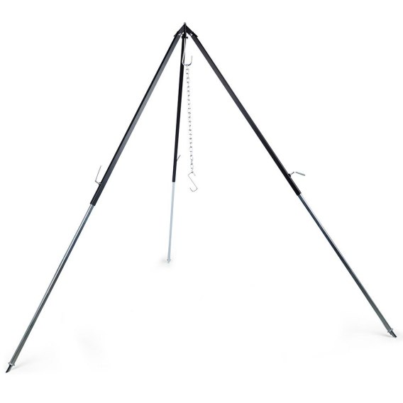 - PRAKTYCZNY TRÓJNÓG - Stojak na kociołek w formie trójnogu z łańcuszkiem i haczykiem. Stojak po rozłożeniu ma wysokość 150 cm, ułatwia przygotowywanie potraw na ognisku. Rozstaw nóg jest na szerokości 145 cm. W połowie wysokości rozłożonego stojaka mieści się ruszt o średnicy 100 cm.