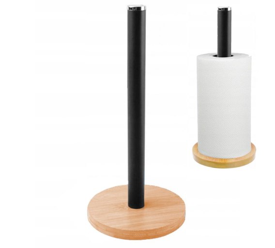 Elegancki i praktyczny stojak na ręcznik papierowy wykonany z wysokiej jakości stali nierdzewnej pokrytej czarnym, matowym lakierem oraz drewna bambusowego. Znajdzie zastosowanie w każdym domu. Wykończony u góry stalową kulką.