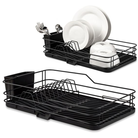 Elegancka suszarka do naczyń w kolorze czarnym. Posiada miejsce na talerze, szklanki oraz sztućce. Wyposażona w tacę ociekową.