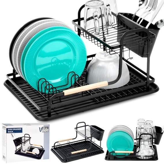Dwupoziomowa, kompaktowa suszarka na naczynia z miejscem na talerze, sztućce oraz inne naczynia. Wykonana z wytrzymałych materiałów. Dzięki niej zapomnisz o nieuporządkowanych naczyniach i mokrych śladach na blacie szafek przy zlewie. Suszarka jest niezwykle pojemna, pozwala na równoczesne suszenie naczyń na dwóch poziomach. Niezbędny element wyposażenia kuchni. Oryginalny produkt marki Vilde. Wyprodukowano zgodnie z europejskimi standardami.