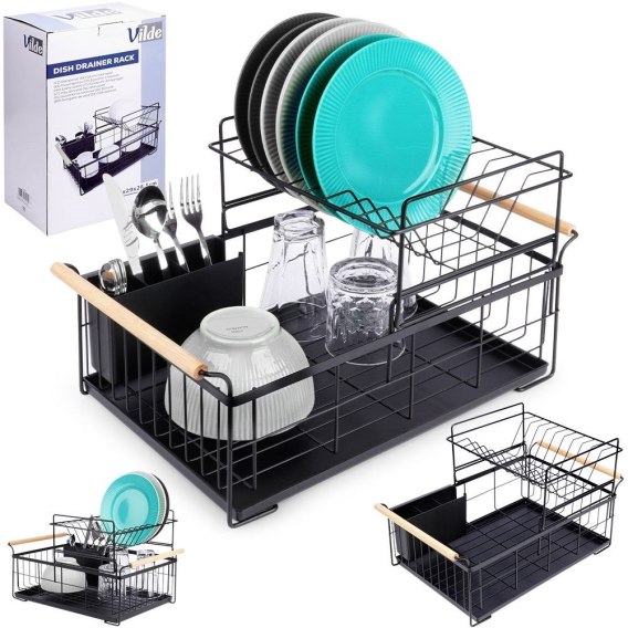 Dwupoziomowa, kompaktowa suszarka na naczynia z miejscem na talerze, sztućce oraz inne naczynia. Wykonana z wytrzymałych materiałów. Dzięki niej zapomnisz o nieuporządkowanych naczyniach i mokrych śladach na blacie szafek przy zlewie. Suszarka pozwala na równoczesne suszenie naczyń na dwóch różnych poziomach. Jest niezwykle pojemna, gdyż posiada miejsce na talerze, kubki, sztućce, a także inne naczynia. Dodatkowo, posiada wyjmowaną tacę ociekową, dzięki czemu utrzymanie jej w czystości nie stanowi problemu. Oryginalny produkt marki Vilde. Wyprodukowano zgodnie z europejskimi standardami.