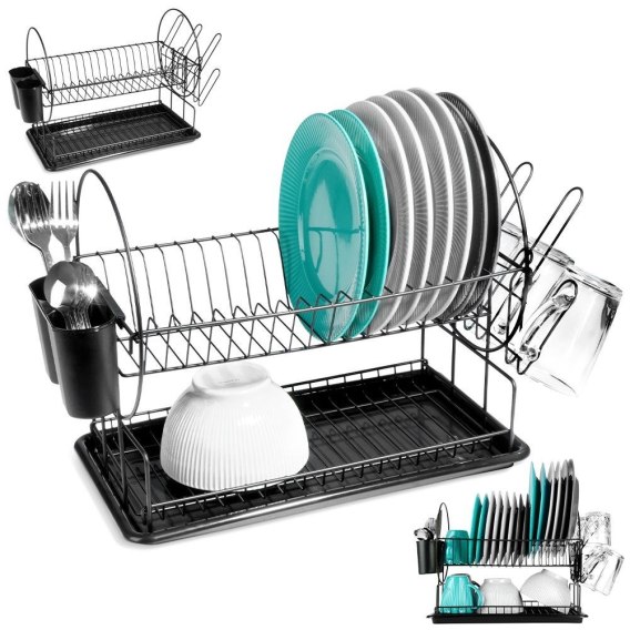 Kompaktowa, dwupoziomowa suszarka do naczyń w kolorze czarnym. Posiada miejsce na talerze, szklanki, kubki oraz ociekacz na sztućce. Wyposażona w tacę ociekową.