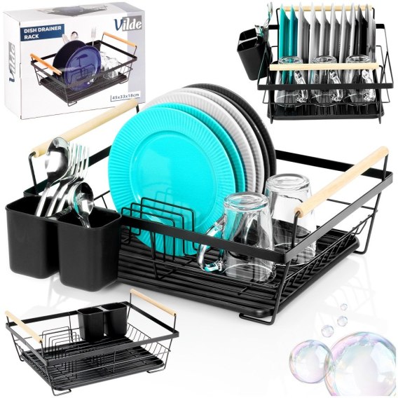 Elegancka suszarka do naczyń w kolorze czarnym kolorze z drewnianymi uchwytami. Posiada miejsce na talerze, szklanki oraz ociekacz sztućce. Wyposażona w wyjmowaną tacę ociekową.