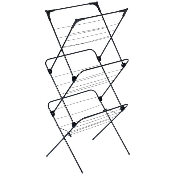 Pionowa suszarka na pranie trzypoziomowa. Suszarka wykonana z solidnych materiałów, utrzymana w modnej, czarnej kolorystyce. Prosty mechanizm składania i rozkładania, dzięki czemu po złożeniu nie zajmuje dużo miejsca. Jej minimalistyczny design sprawi, że doskonale wkomponuje się w każde pomieszczenie. Niezbędna w każdym domu. Odpowiednio użytkowana posłuży długie lata. Oryginalny produkt marki Vilde. Wyprodukowano zgodnie z europejskimi standardami.
