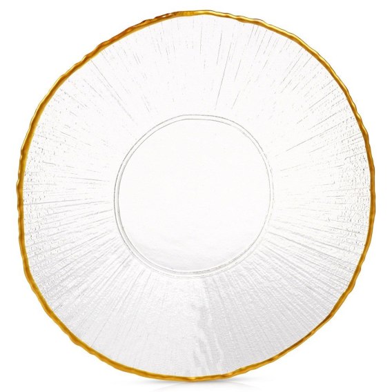 - Wykonany ze szkła - Wykonany z najwyższej jakości przezroczystego szkła, które swoją strukturą imituje kryształ. Rant talerza jest w kolorze złotym. Odpowiednio użytkowany posłuży długie lata.