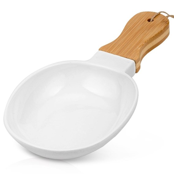 Talerz z uchwytem do serwowania różnych dań i przekąsek. Wykonany z białej porcelany i drewna bambusowego. Prezentuje się niezwykle elegancko i nowocześnie.