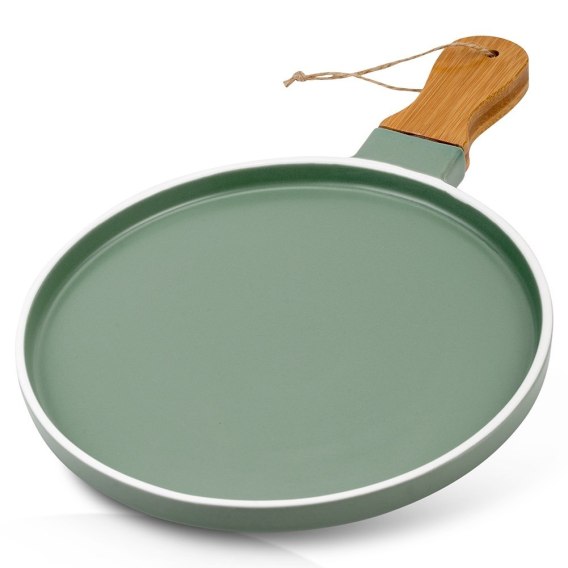 Talerz z uchwytem do serwowania różnych dań i przekąsek. Wykonany z porcelany w zielonym kolorze i drewna bambusowego. Prezentuje się niezwykle elegancko i nowocześnie.