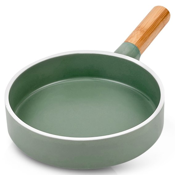 Talerz z uchwytem do serwowania różnych dań i przekąsek. Wykonany z porcelany w zielonym kolorze i drewna bambusowego. Prezentuje się niezwykle elegancko i nowocześnie.