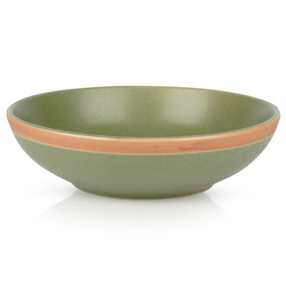 Talerz obiadowy głęboki wykonany z ceramiki w zielonym kolorze, z efektownym, kamionkowym brzegiem. Idealny do serwowania zup, makaronów czy sałatek. Nadaje się do zmywarki i mikrofalówki.