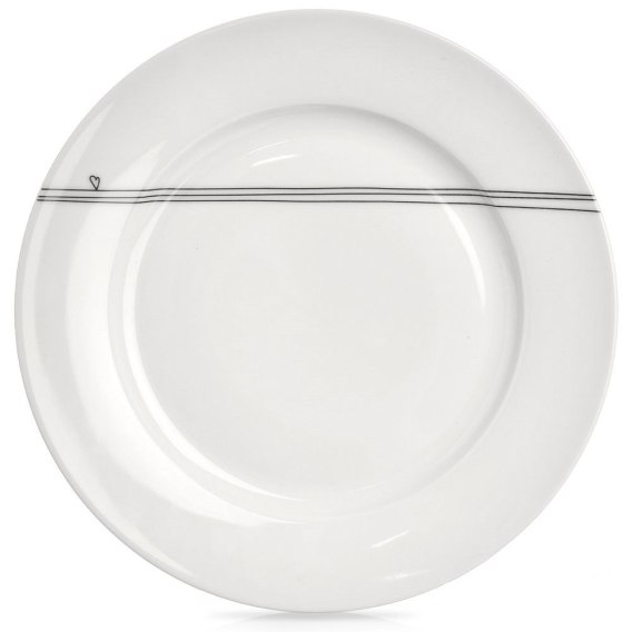 Talerz obiadowy płytki wykonany z porcelany w białym kolorze z motywem serduszka. Wykorzystamy go do serwowania wielu rodzajów posiłków. Nadaje się do zmywarki.