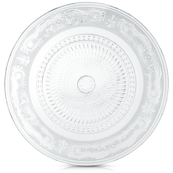 Płytki talerz obiadowy wykonany ze szkła z pięknymi zdobieniami. Swoim wyglądem przypomina kryształ. Sprawdzi się również jako patera na ciasta, przekąski i desery.