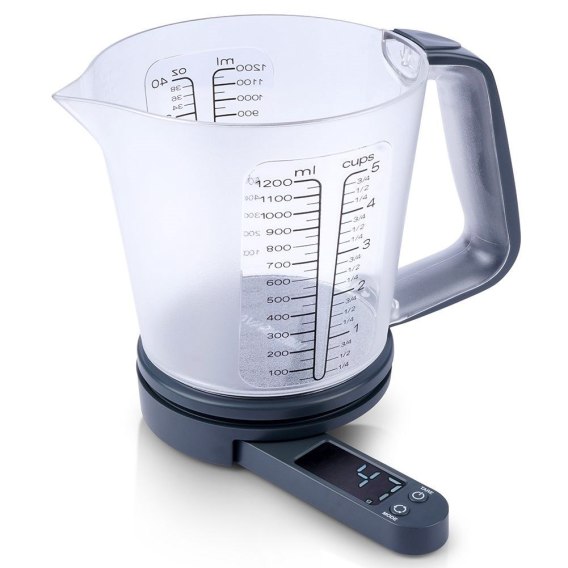 Cyfrowa waga kuchenna z dzbankiem posiadającym miarkę od 100 do 1200 ml. Maksymalne obciążenie to 5 kg. Posiada 3 tryby wagi oraz wyświetlacz LED.