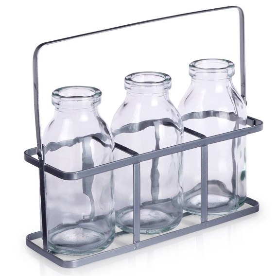 Zestaw trzech szklanych wazonów usadowionych na metalowym stojaku. Zestaw idealny na kwiaty żywe oraz sztuczne, a także ozdoby dekoracyjne.