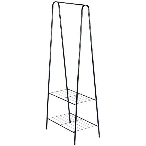 Wieszak podłogowy na ubrania. Idealnie sprawdzi się w domu, biurze, poczekalni oraz garderobie. Wyposażony w dwie półki na buty lub akcesoria. Wykonany z metalu w czarnym kolorze.