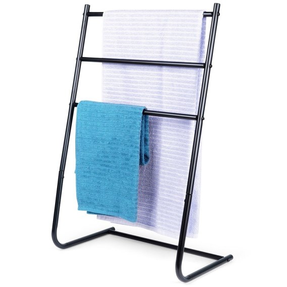 Praktyczny, wolnostojący wieszak na ręczniki lub ubrania. Posiada 3 poprzeczki do zawieszenia. Wykonany z metalu w kolorze czarnym.