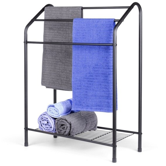 Praktyczny, wolnostojący wieszak na ręczniki lub ubrania. Posiada 3 poprzeczki oraz dodatkową półkę do przechowywania. Utrzymany w modnym, czarnym kolorze.