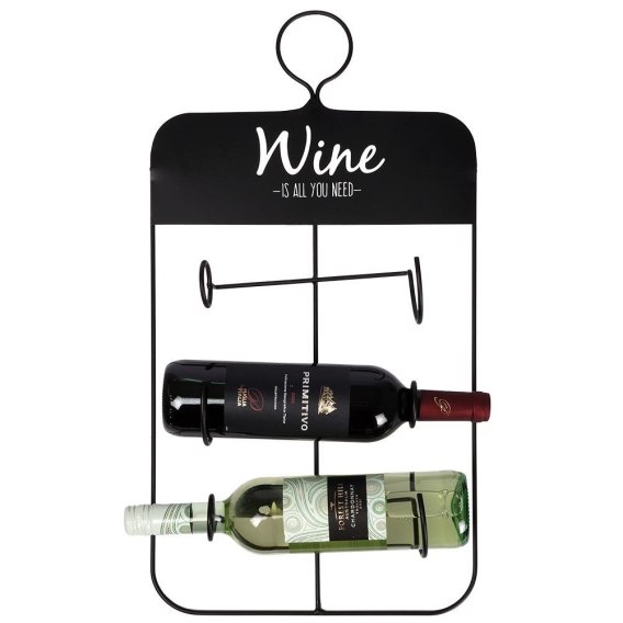 Stojak na trzy butelki wina. Stojak należy zawiesić na ścianie. Przeznaczony do przechowywania trzech butelek wina. Wykonany z metalu w czarnym kolorze.