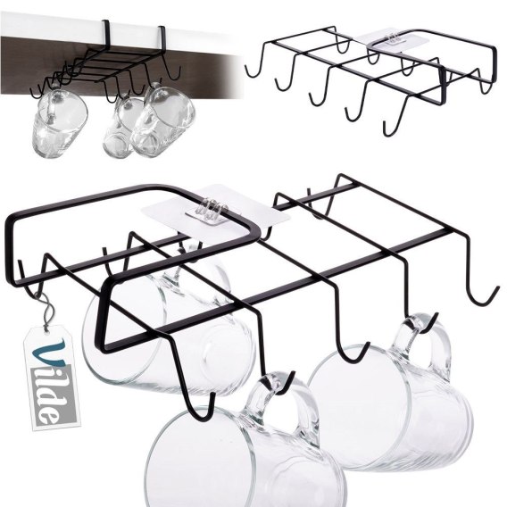 Praktyczny wieszak kuchenny na kubki lub filiżanki. Wykonany z metalu w czarnym kolorze. Nie wymaga wiercenia, montowany do górnych szafek kuchennych.