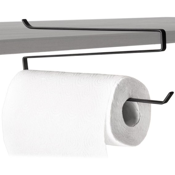 Wieszak kuchenny wykonany z czarnego metalu na ręczniki papierowe. Nie wymaga wiercenie, montowany do górnych szafek kuchennych.