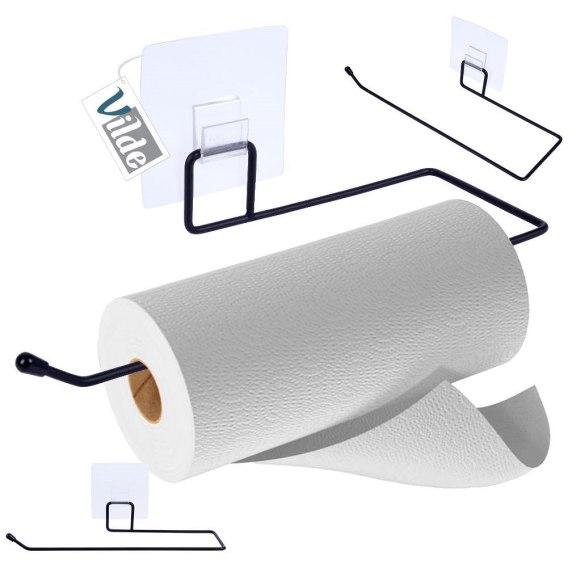 Wieszak kuchenny wykonany z czarnego metalu na ręczniki papierowe. Wyposażony w mocną samoprzylepną podkładkę, dzięki czemu nie wymaga wiercenia.