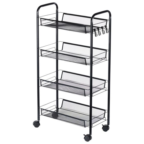 Praktyczny 4-piętrowy wózek na kółkach. Znajdzie zastosowanie w domu, warsztacie i biurze. Wykonany z metalu w czarnym kolorze.