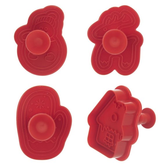 - PRAKTYCZNE - Zestaw czterech wykrawaczy cukierniczych wraz z tłokiem w kształcie: renifera, rękawicy, domku oraz bałwana. Idealne do przygotowania ciasteczek i pierników na Boże Narodzenie.