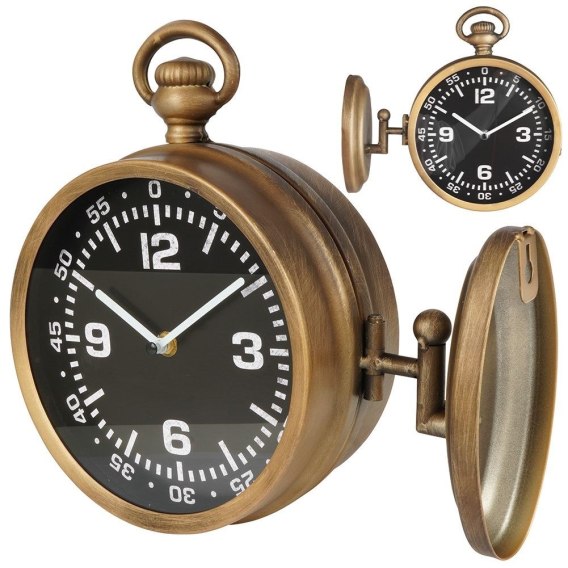 Zegar dwustronny utrzymany w antycznym stylu. Tarcza zegara w kolorze czarnym, wskazówki białe a rama zegara w kolorze podstarzanego złota.