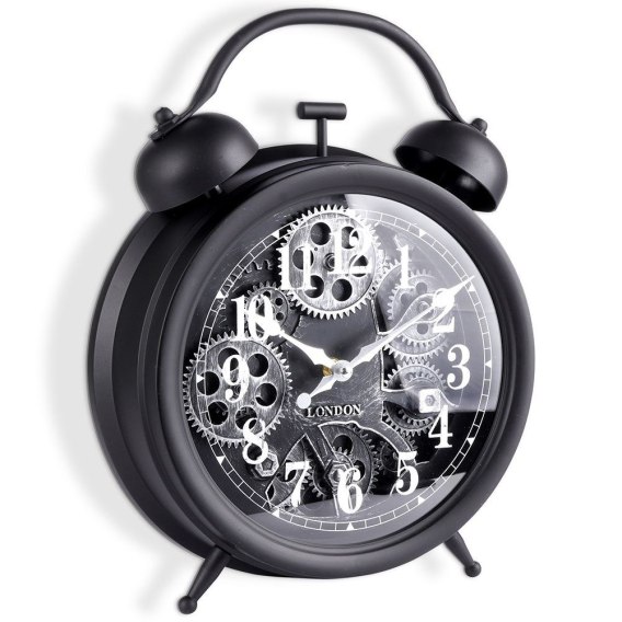 Wyjątkowy zegar ścienny w kształcie budzika w kolorze czarnym. Tło zegara stanowią ruchome koła zębate w kolorze srebrnym. Zegar posiada wyraźne cyfry i wskazówki.