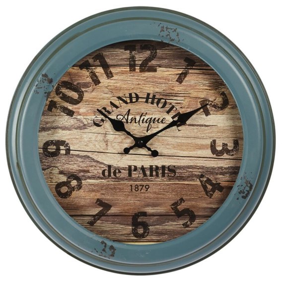 Wyjątkowy, metalowy zegar ścienny w stylu industrialnym o średnicy 41 cm. Utrzymany w antycznym stylu z podstarzaną ramą w kolorze niebieskim.