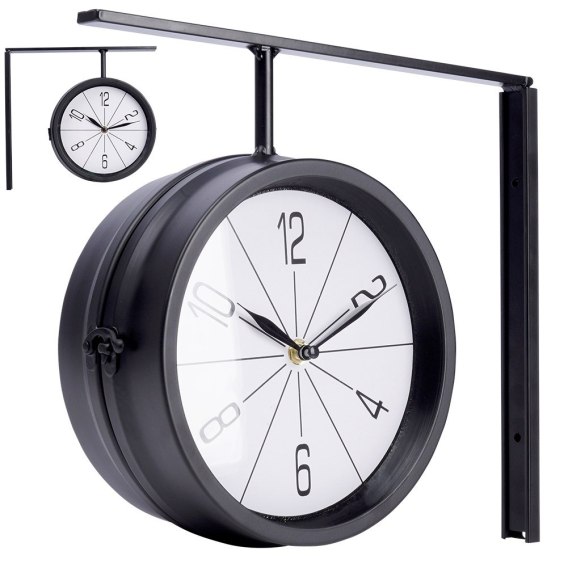 • DWUSTRONNY - Zegar ścienny, dwustronny. Z jego pomocą w łatwy sposób odczytamy godziny z dwóch stron pomieszczeń w których zostanie umiejscowiony. Wymiary zewnętrzne zegara 30,5 x 9,5 x 28 cm. Tarcza zegara ma średnicę 20 cm. Zasilany 2x bateria AA 1,5V (brak w zestawie).