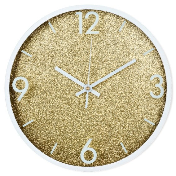 Efektowny zegar ścienny o średnicy 29,5 cm. Utrzymany w klasycznym stylu. Wskazówki, cyfry i rama w kolorze białym, a tarcza brokatowa w złotym kolorze.