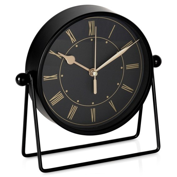 Zegar do postawienia na komodzie, biurku czy stoliku. Będzie informował o aktualnej godzinie, ale również pełni funkcję ozdobną. Wykonany z metalu w kolorze czarnym ze złotymi wskazówkami.