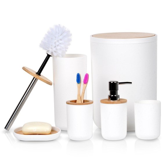 Przydatny zestaw akcesoriów łazienkowych w białym kolorze z elementami bambusowymi. Składający się z: dozownika na mydło, mydelniczki, 2x kubka, szczotki do WC oraz kosza na śmieci.