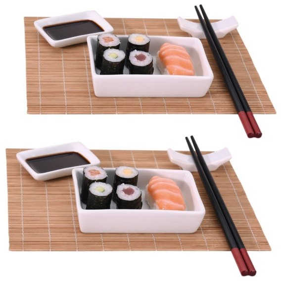 Zestaw do serwowania sushi dla dwóch osób. W zestawie znajduje się 12 niezbędnych akcesoriów do serwowania sushi. Świetny pomysł na prezent.